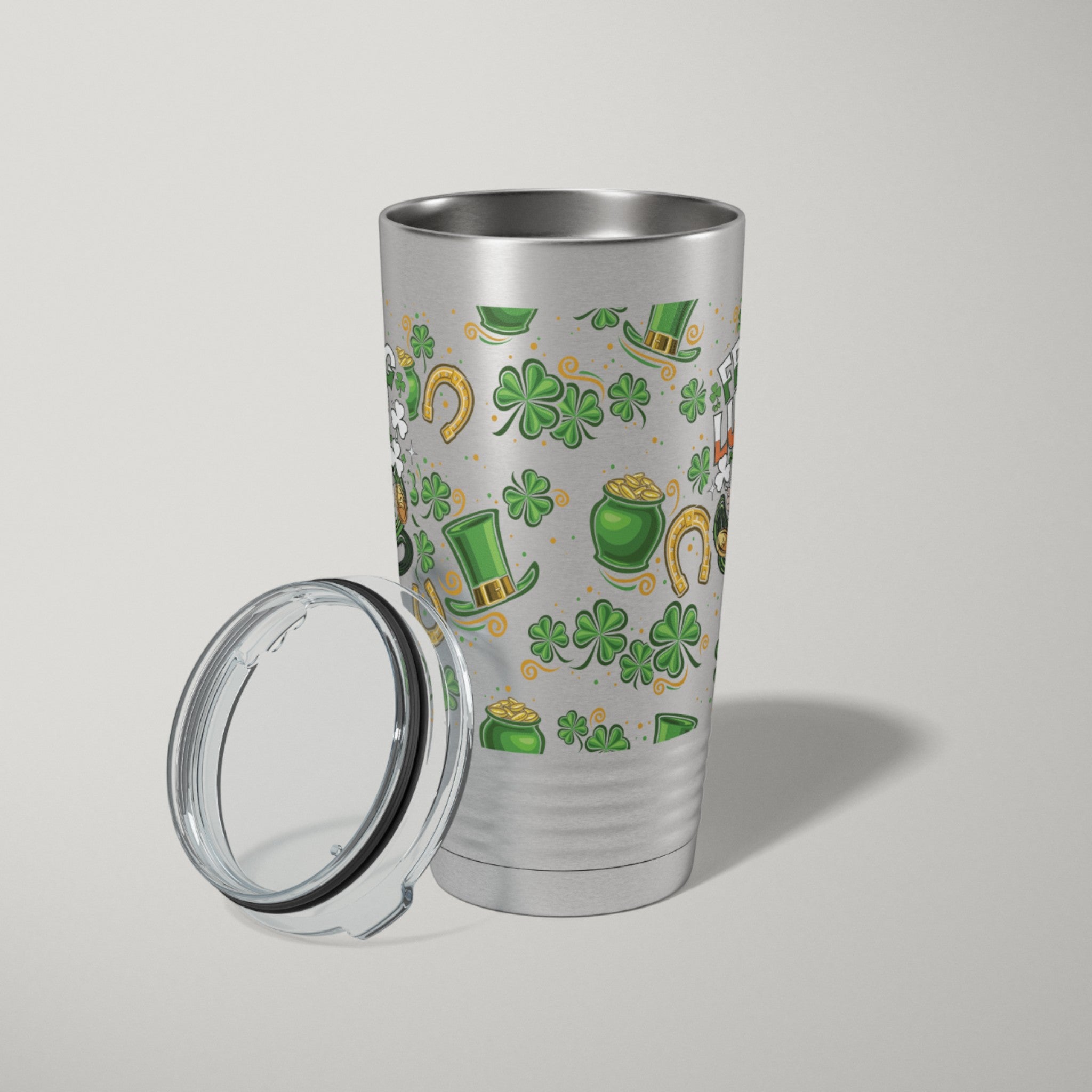 Feel the St. Patrick’s Day vibe with this 20oz Polar Camel tumbler, rocking a UV-printed ‘Feeling Lucked Up’ full wrap that lasts—bundled with a 16oz UV-printed pint glass featuring ‘Happy Saint Patricks Day’ in green and gold. Keeps drinks cold 24 hours or hot 12, sweat-proof, and dishwasher-safe—ideal for Irish flair or gifting. Ships in 48 hours from our local warehouse—get it for March 17!